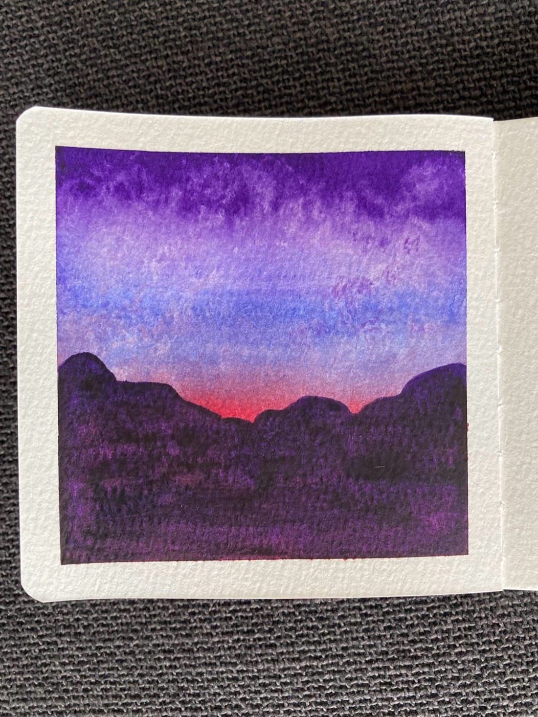 A watercolor painting of a purple sky that fades into blue and then to a sliver of bright red peeking over the horizon. In the sky are wispy clouds. In the foreground are deep purple mountains.