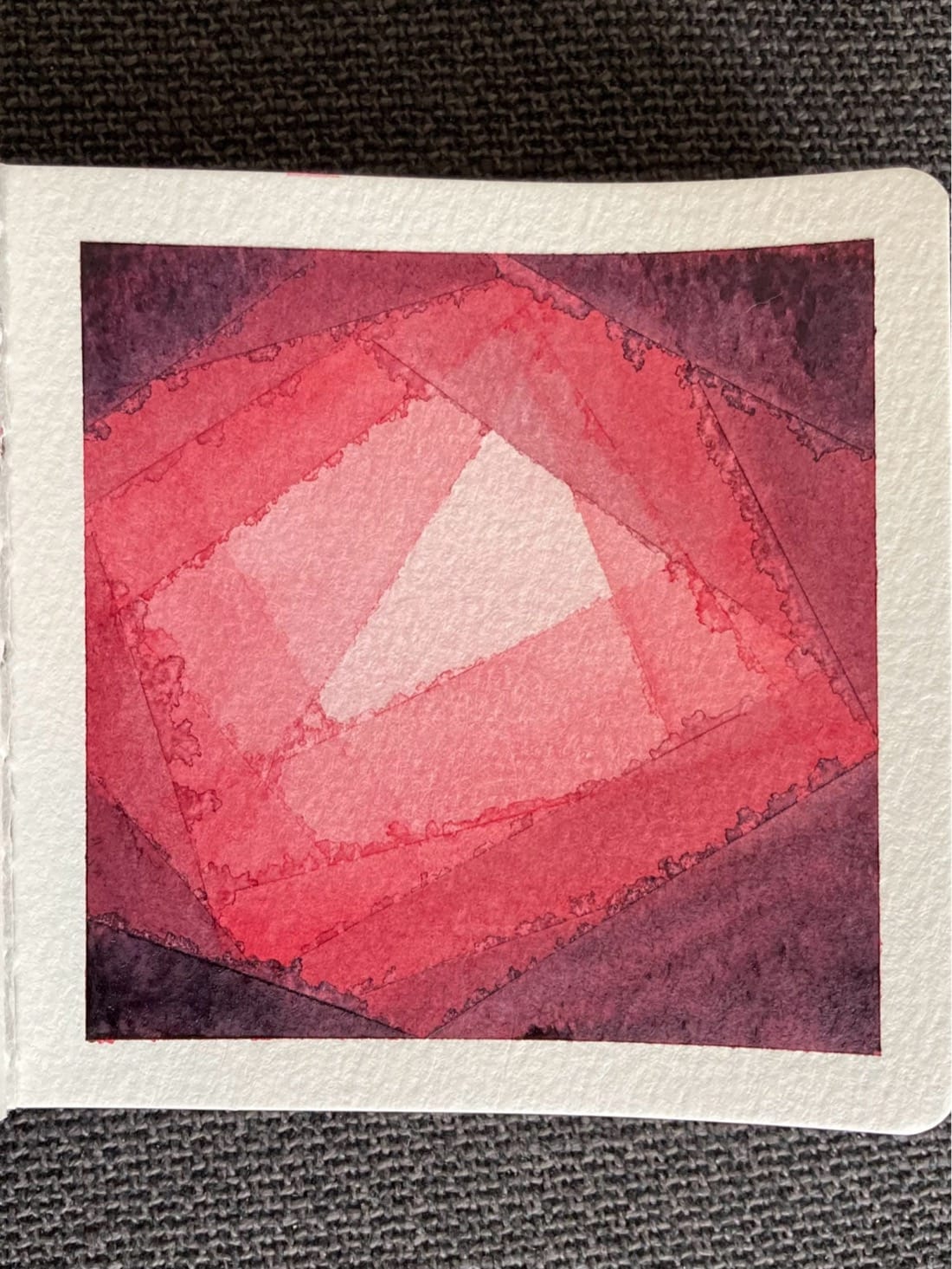 A watercolour painting of a square. The middle of the square is a light pink color. There are increasingly dark, staggered, triangular layers of paint over the corners. It has the appearance of an angular portal.