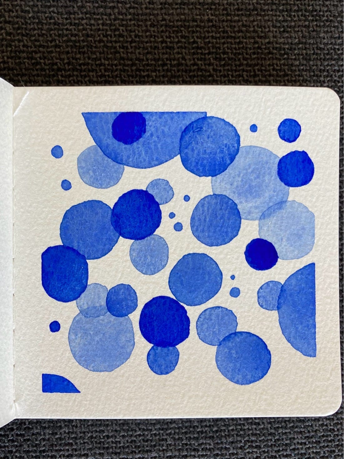 A watercolour painting of blue circles. The blue circles of various sizes are scattered across the page in light, medium, and dark shades of blue. Some of the circles overlap.