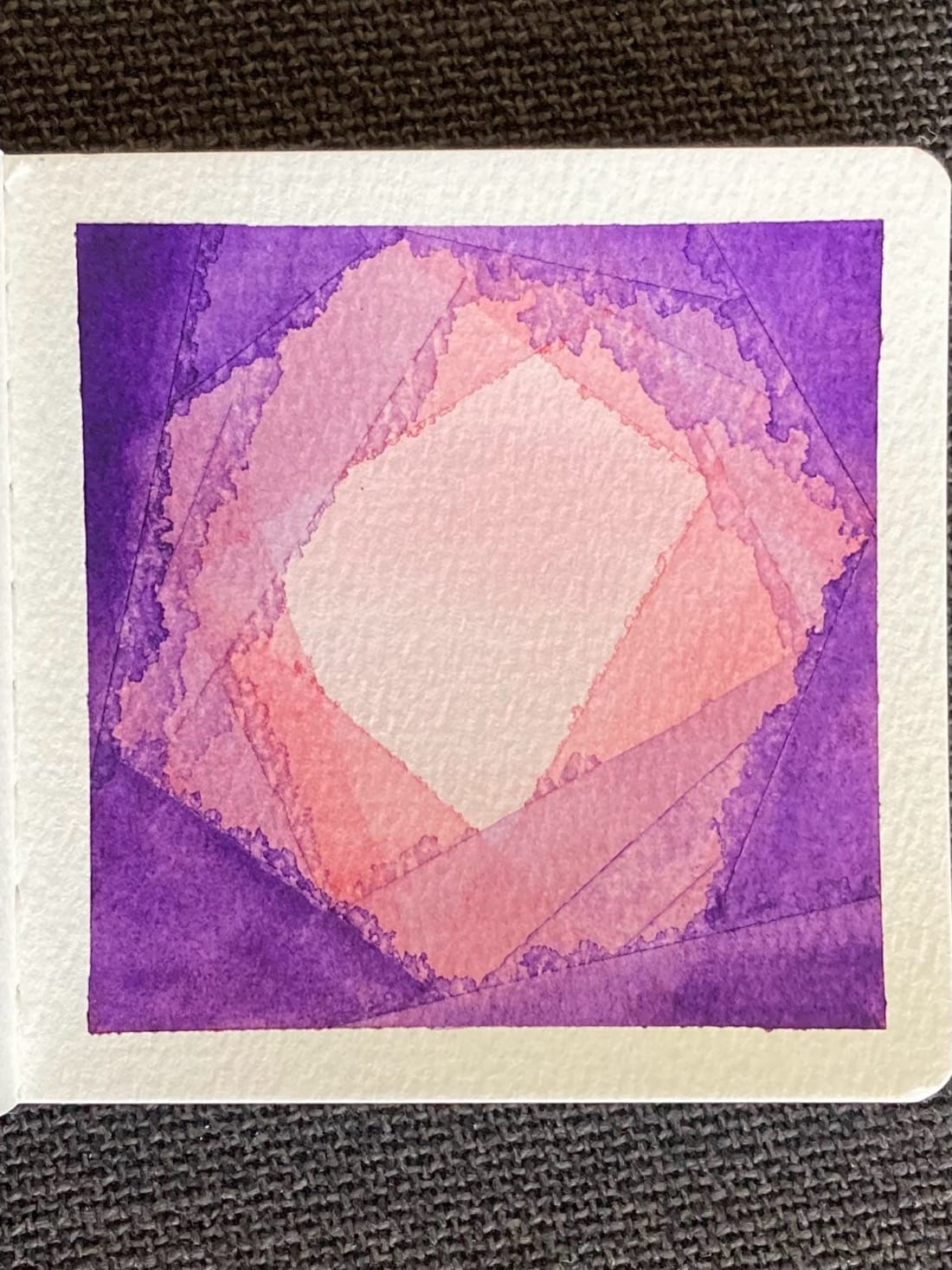 A watercolor painting reminiscent of the facets inside a prism or crystal in pinks and purples.