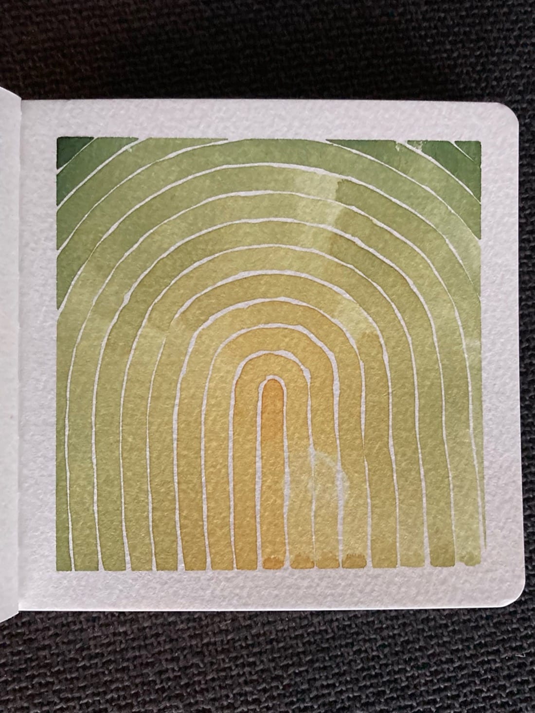 A watercolor painting of concentric arches, starting with a gold in the center and gradually changing to a deep mossy green at the far edges.