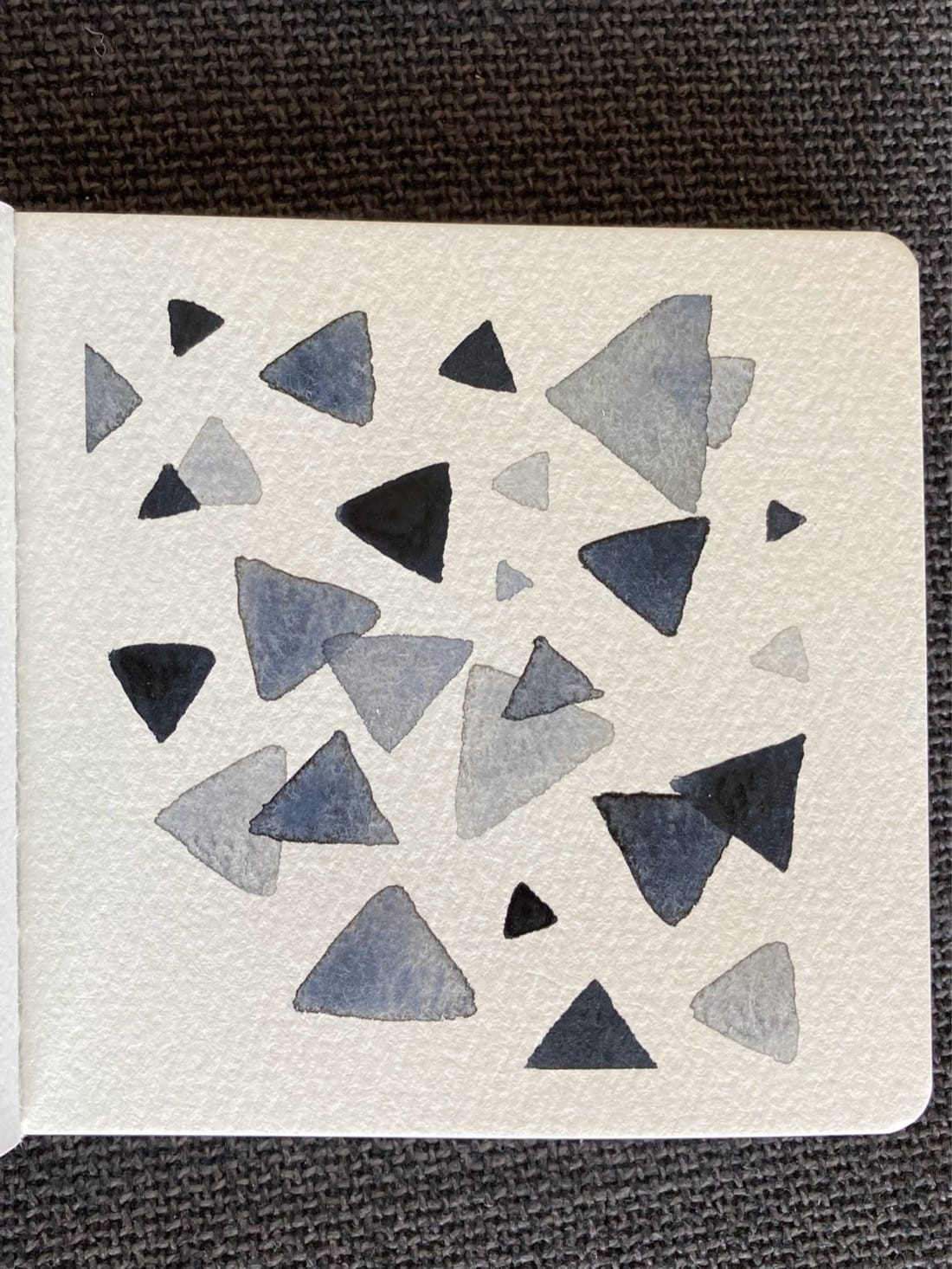 A watercolor painting of grey triangles. The triangles are in multiple sizes, orientations, and saturation. Some triangles overlap others.