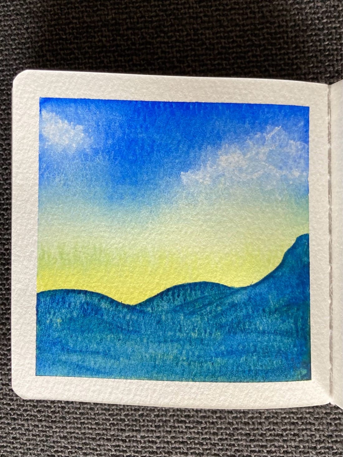 A watercolor painting of blue sky with puffy white clouds. There are blue-green mountains in the foreground. The sky just above the mountains is a brilliant, bright yellow that fades into the cobalt blue sky above it.