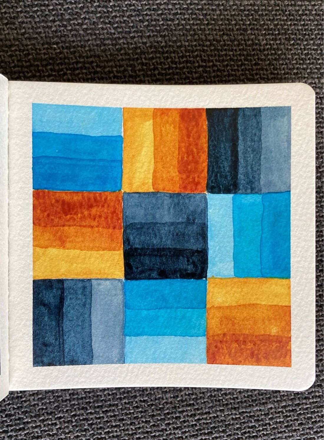 A watercolor painting of a 3x3 grid of cobalt, indigo, and gold squares. Each square is divided into three segments of light, medium, and dark.