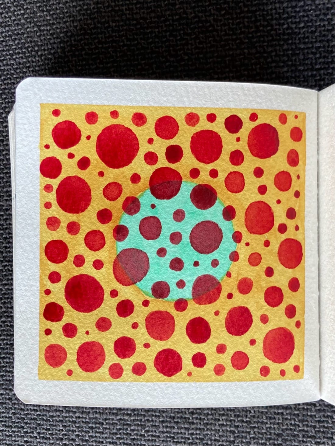 A watercolor painting of Yayoi Kusama-inspired dots. The background is a medium gold with a pale green circle in the middle. Red dots of various sizes are scattered across the painting.