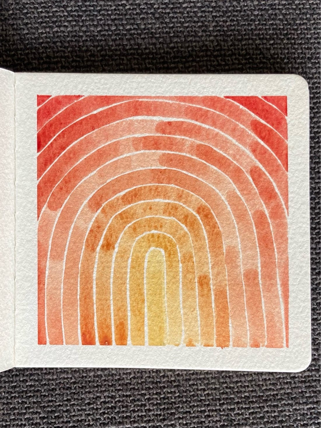 A watercolor painting of a series of nested arches, starting with a deep yellow for the inner arch and changing gradually to red for the outer arches.