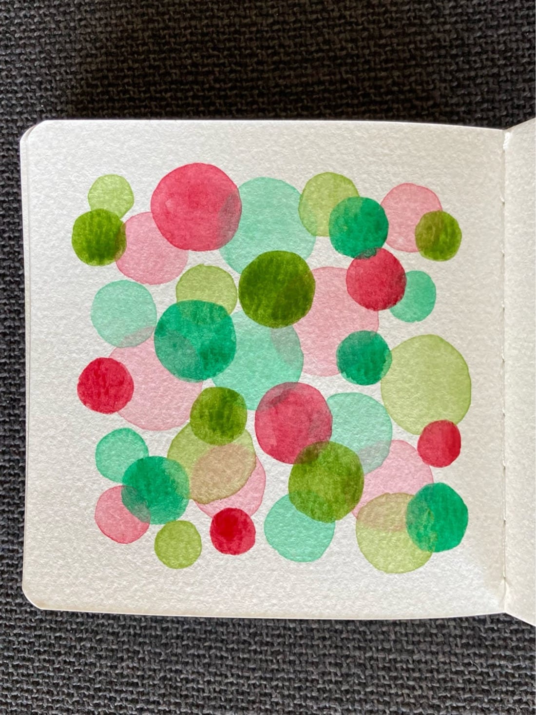 A watercolor painting of overlapping circles in pink and two shades of green. The circles are different sizes. Some are lightly saturated while others are heavily saturated.
