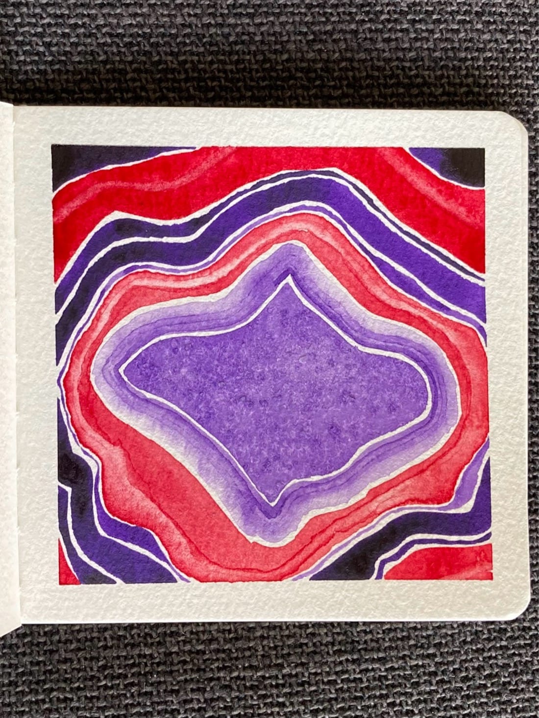 A watercolor painting of the inside of a red and purple geode. The purple center is large & irregularly shaped. There are bands of red and purple surrounding it.