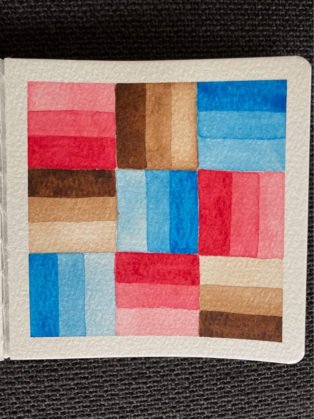 A watercolor painting of a 3x3 grid of squares in pink, blue, and brown. Within each square are three stripes of a color in increasing saturation from pastel to fully saturated.