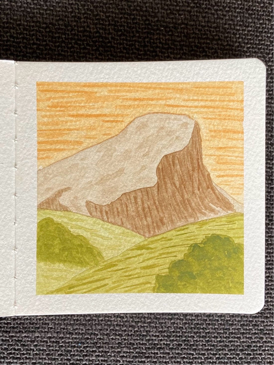 A watercolor landscape painting. A large mountain,with a cliff on its right face, is centered, looming over two sloping green hills. There are bushes on the hills. The sky is streaky orange.