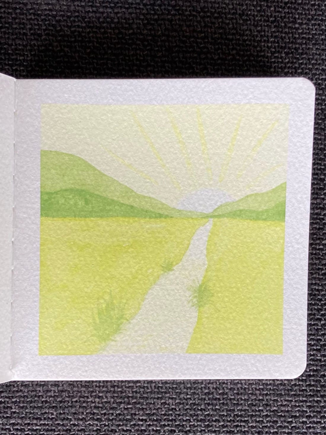 A watercolor landscape of a field with a stream that stretches off towards some distant mountains. The sun is rising above the mountains. There are a few plants growing along the banks of the stream.