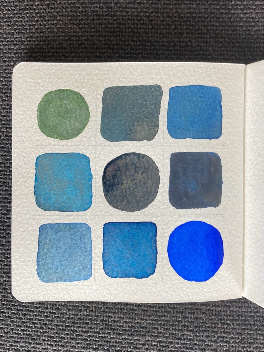 A 3x3 color mixing chart. On the diagonal from top left to bottom right are circles of green, sparkly navy blue, and cobalt blue. Filling out the rest of the grid are squares of the blended colors with saturated blends above the diagonal and light blends below.