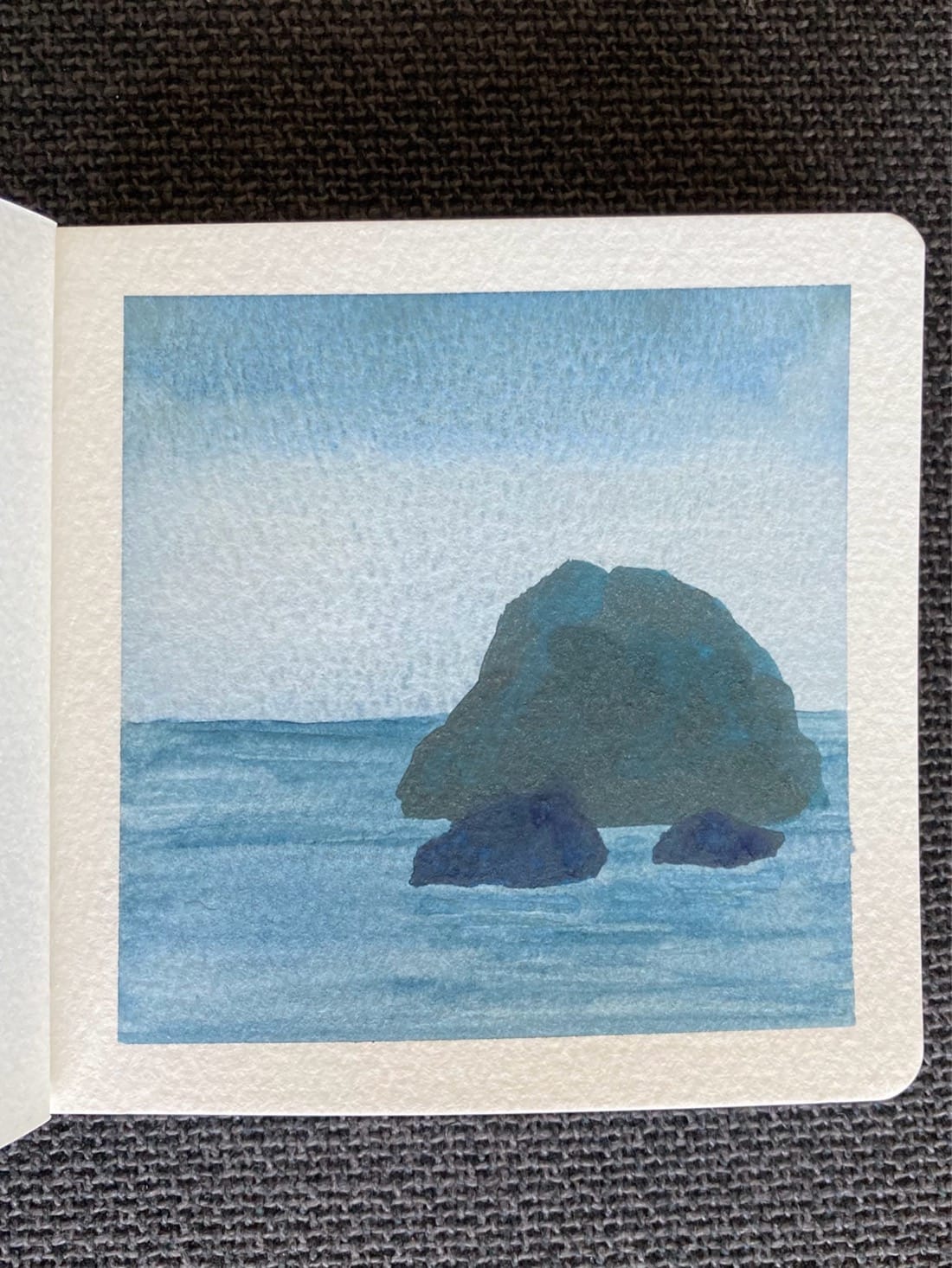 A watercolor painting of a large rock island in the ocean under a grey blue sky. There are two smaller rocks clustered next to the larger rock.