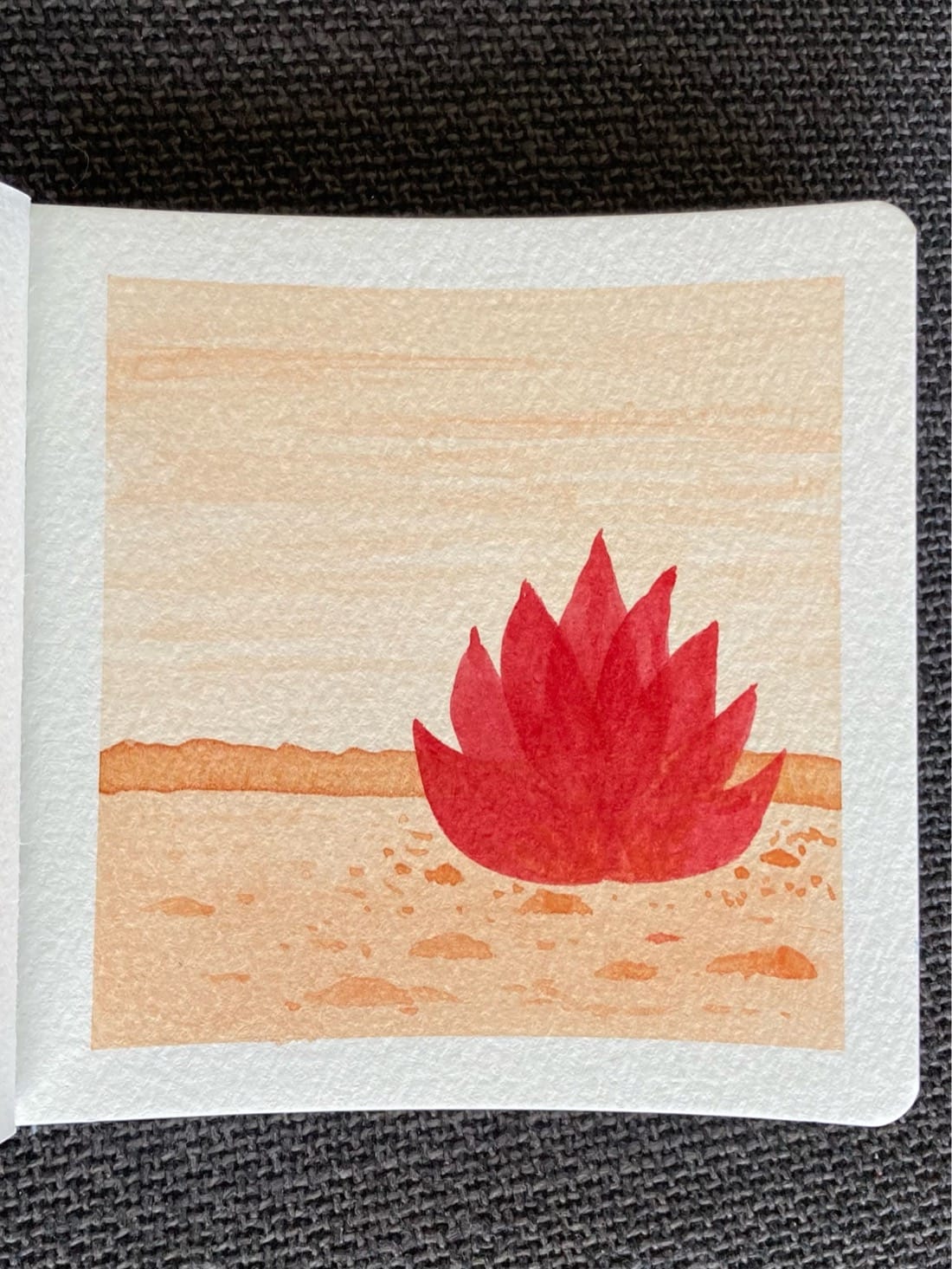 A watercolour landscape of a rocky desert. A range of mountains is in the distance. In the foreground is a massive red succulent plant. The sky is a hazy pale orange.