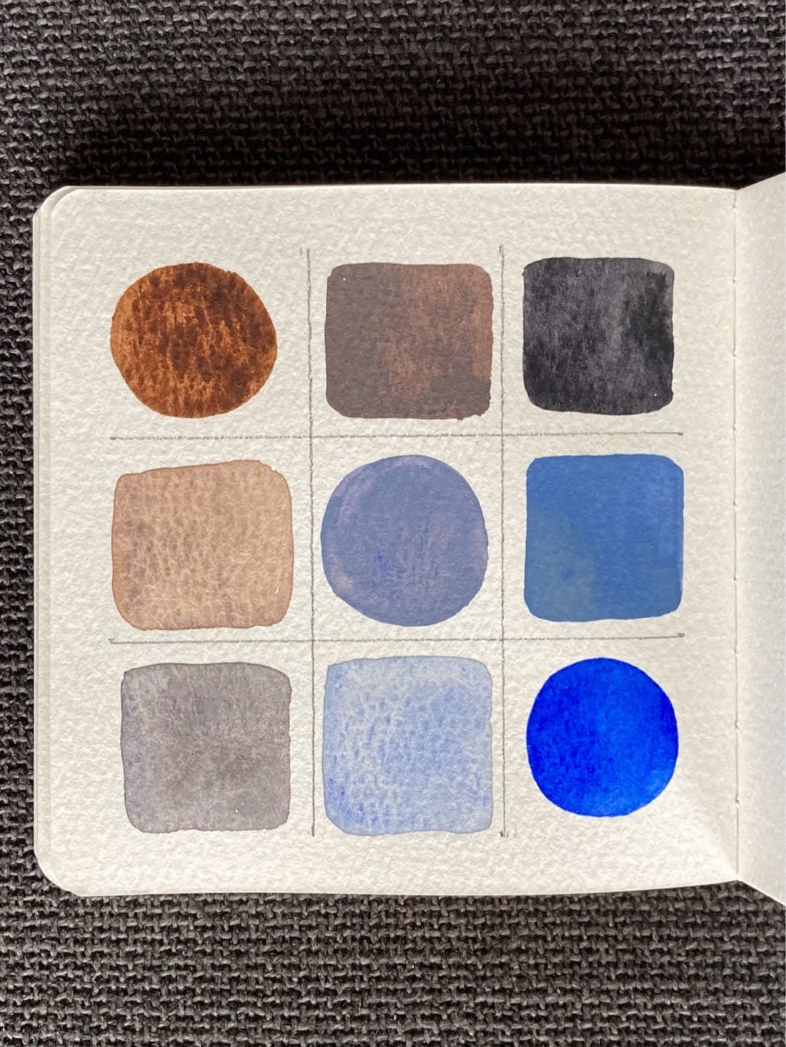 A 3x3 color mixing chart. On the diagonal from top left to bottom right are circles of brown, medium gray, and ultramarine blue. Filling out the rest of the grid are squares of the blended colors with saturated blends above the diagonal and light blends below.
