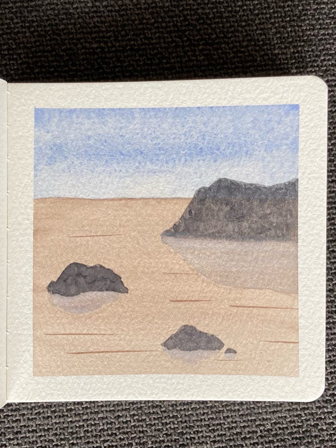 A watercolor landscape painting of a desert under a blue sky. There is one large rock in the distance and two smaller rocks in the foreground.
