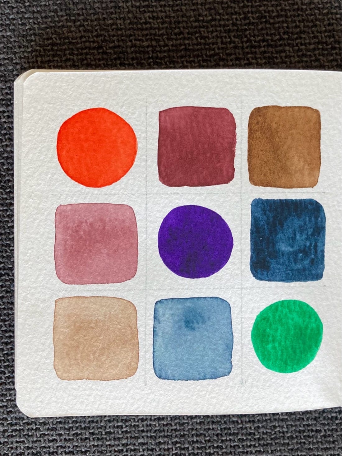 A 3x3 color mixing chart. On the diagonal from top left to bottom right are circles of red-orange, deep purple, and emerald green. Filling out the rest of the grid are squares of the blended colors with saturated blends above the diagonal and light blends below.