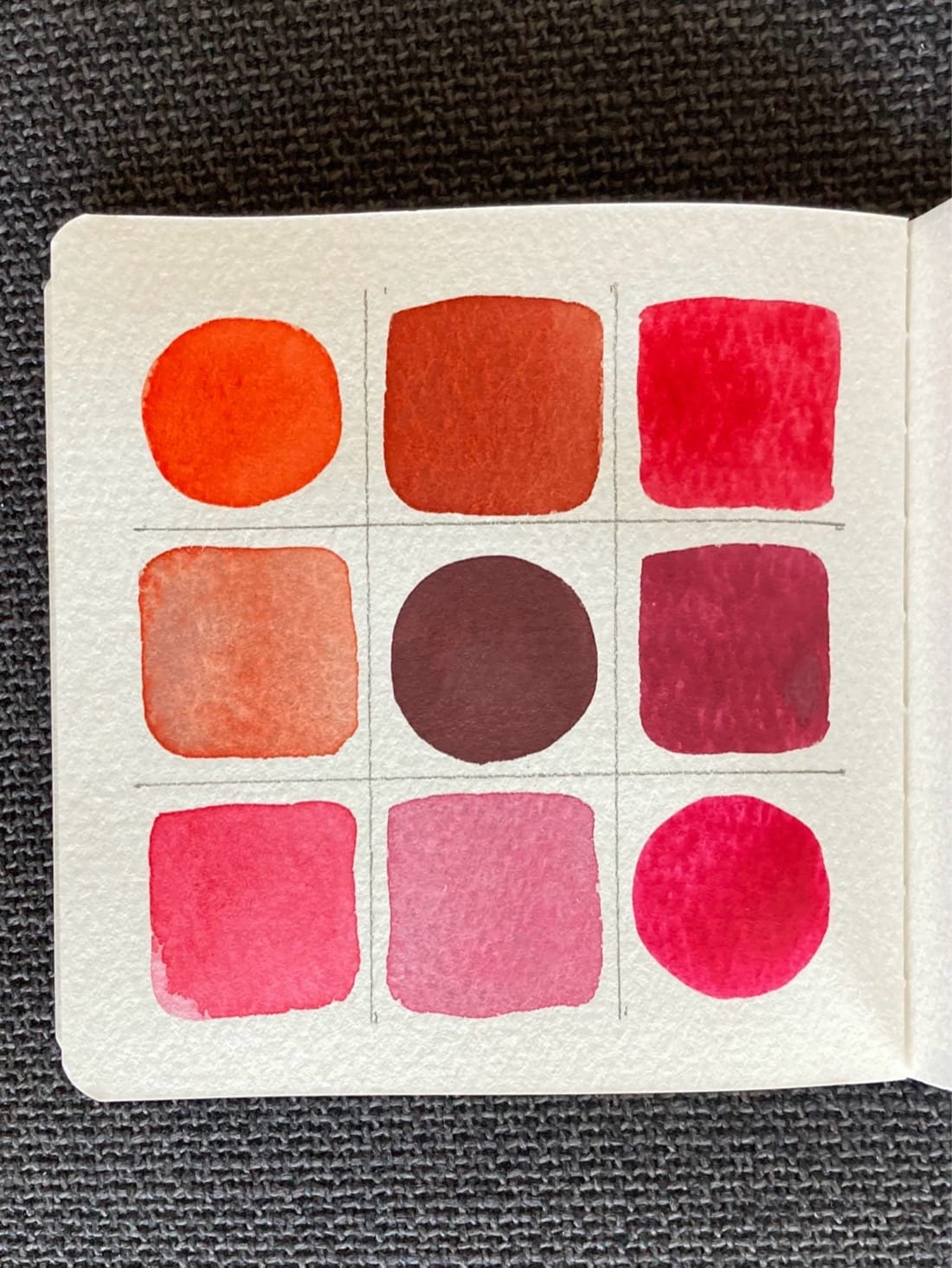 A 3x3 color mixing chart. On the diagonal from top left to bottom right are circles of orange-red, deep burgundy, and deep pink. Filling out the rest of the grid are squares of the blended colors with saturated blends above the diagonal and light blends below.