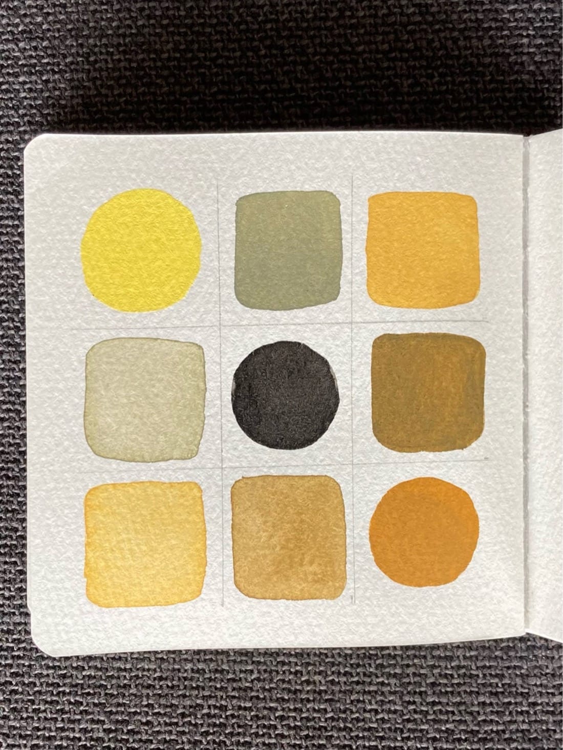 A 3x3 color mixing chart. On the diagonal from top left to bottom right are circles of buttery yellow, black, and deep yellow. Filling out the rest of the grid are squares of the blended colors with saturated blends above the diagonal and light blends below.