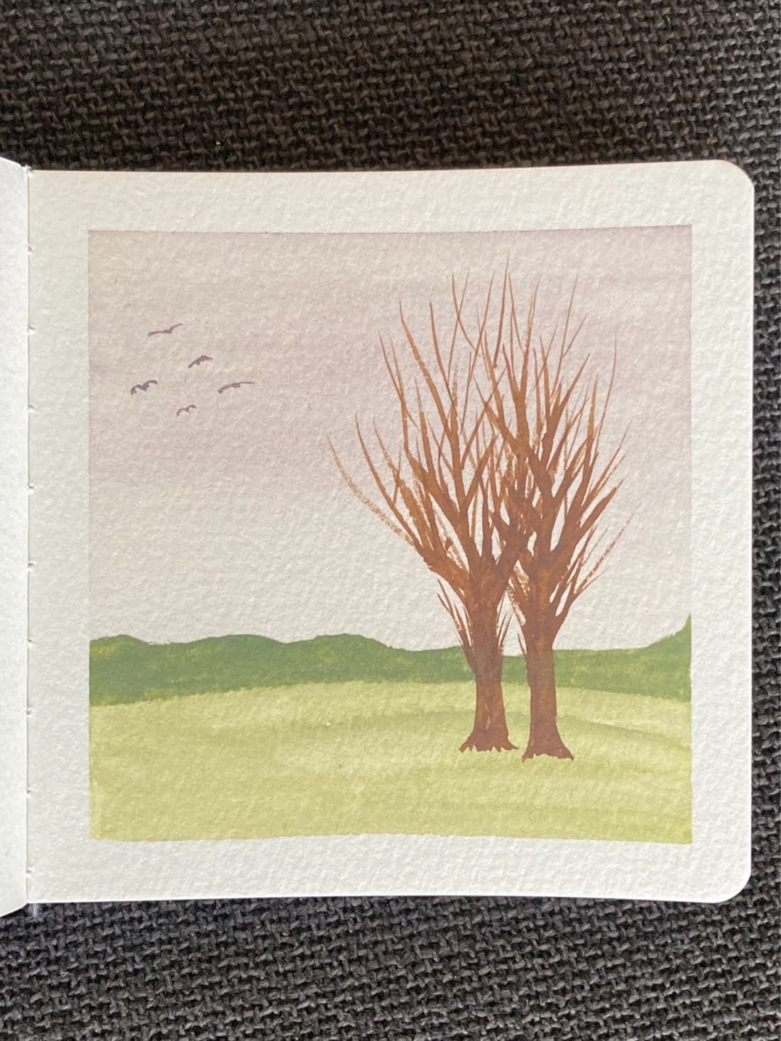 Watercolour landscape painting of a pair of leafless trees standing in a green field. In the distance are green rolling hills. The sky is a pale purple and there are birds flying in the sky to the left of the trees.
