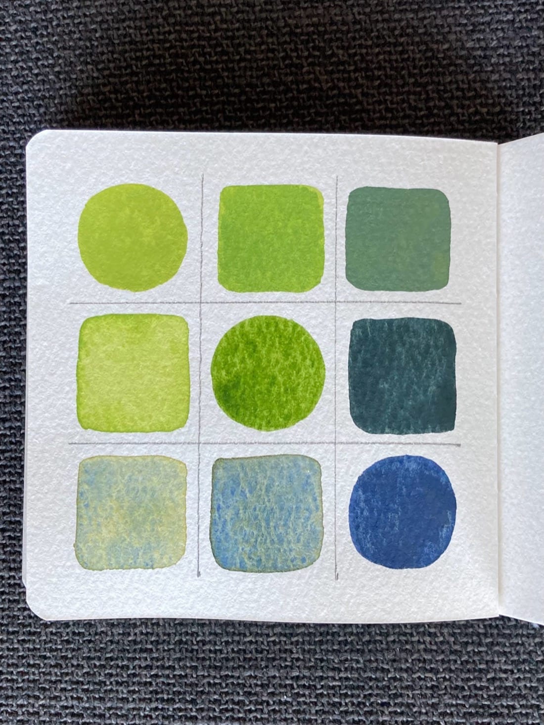 A 3x3 color mixing chart. On the diagonal from top left to bottom right are circles of a medium milky green, medium green, and denim blue. Filling out the rest of the grid are squares of the blended colors with saturated blends above the diagonal and light blends below.