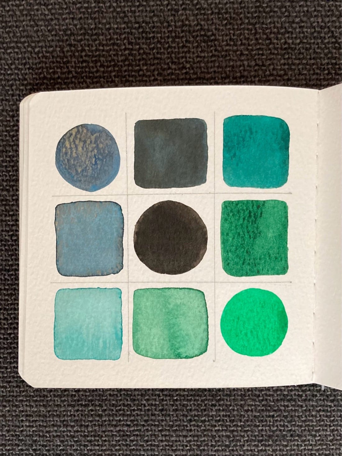 A 3x3 color mixing chart. On the diagonal from top left to bottom right are circles of sparkly deep blue, black, and saturated green. Filling out the rest of the grid are squares of the blended colors with saturated blends above the diagonal and light blends below.