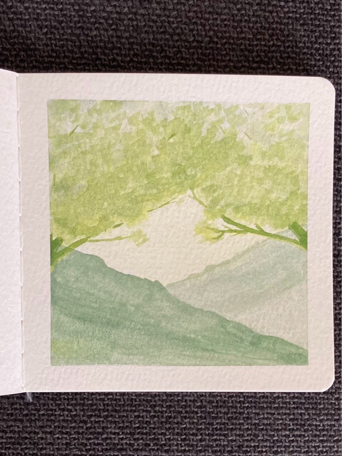 A watercolor painting of two overlapping mountains, with leafy green tree branches above them.