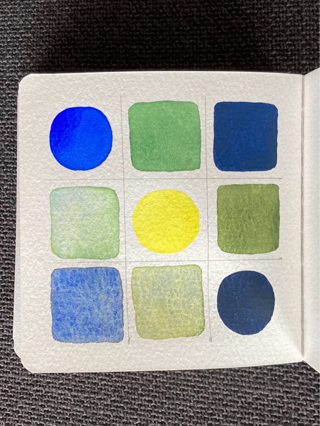 A 3x3 color mixing chart. On the diagonal from top left to bottom right are circles of cobalt blue, yellow, and deep navy blue. Filling out the rest of the grid are squares of the blended colors with saturated blends above the diagonal and light blends below.