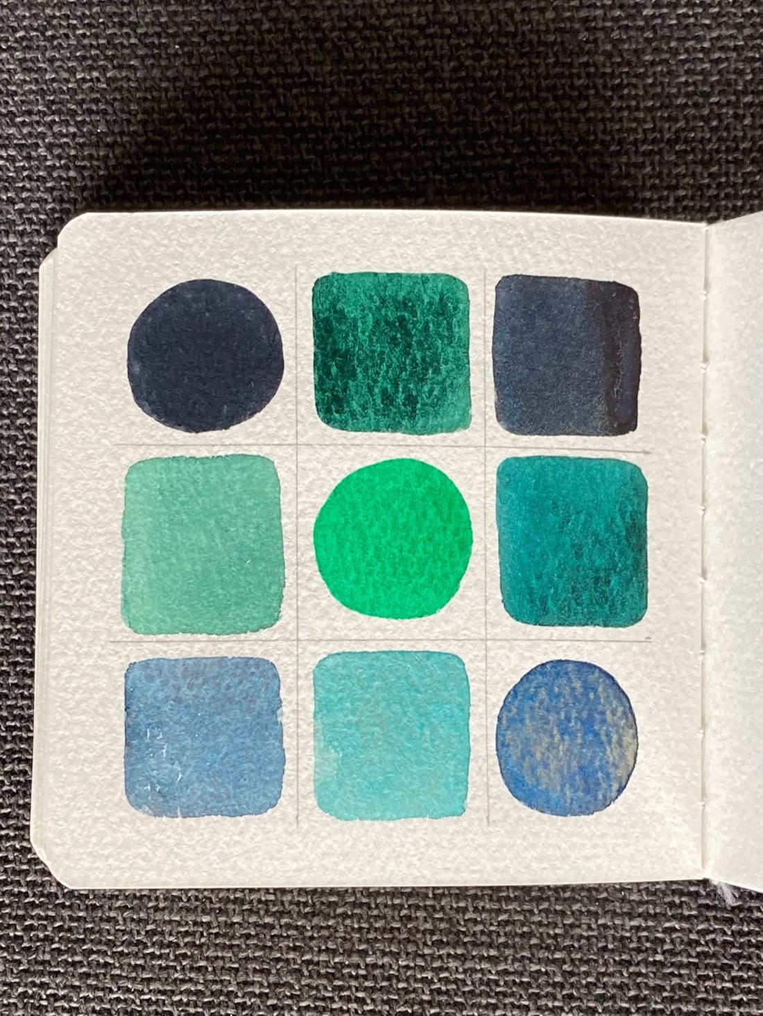 A 3x3 color mixing chart. On the diagonal from top left to bottom right are circles of dark gray, green, and sparkly deep blue. Filling out the rest of the grid are squares of the blended colors with saturated blends above the diagonal and light blends below.