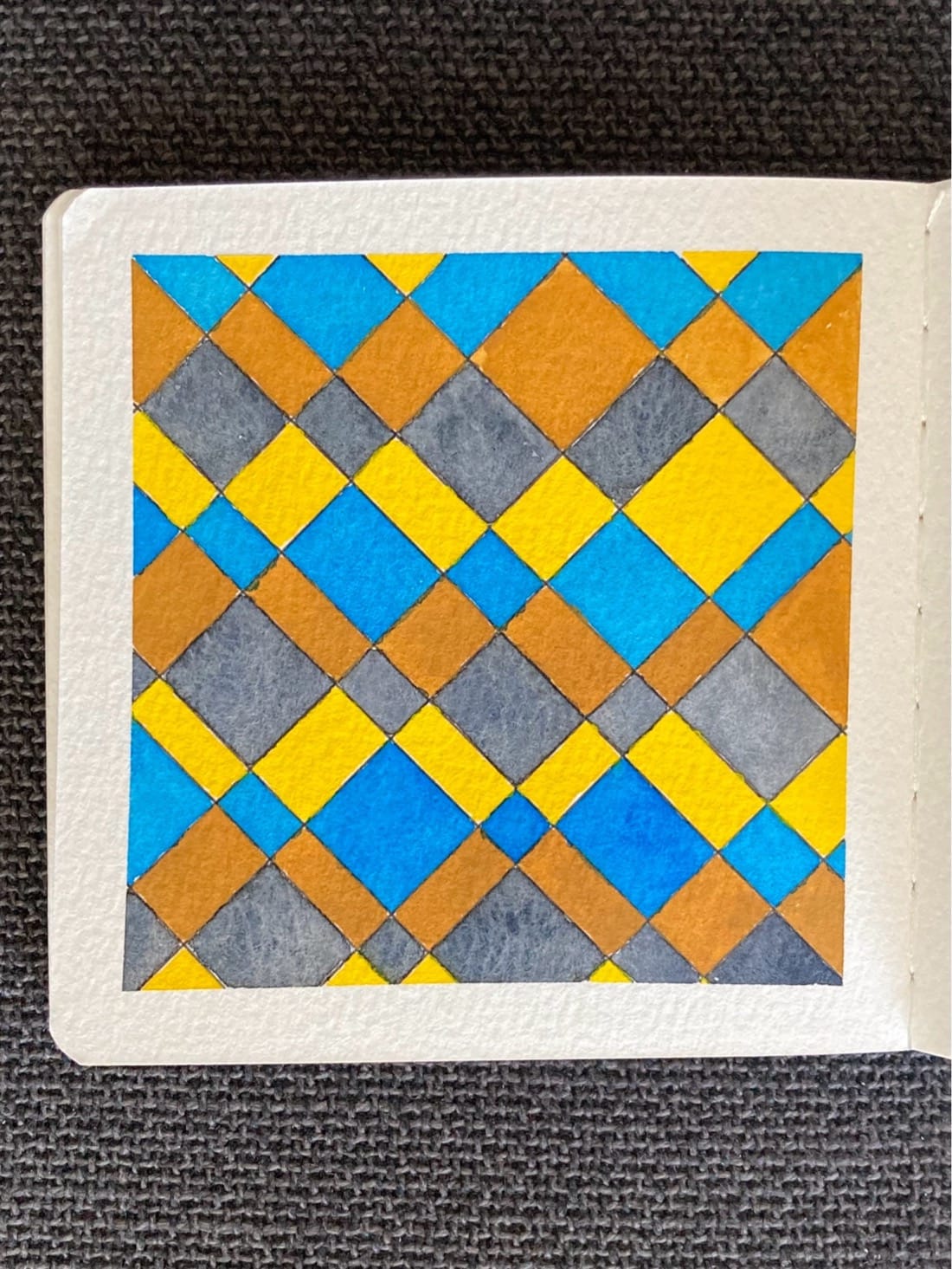 A watercolor painting of a diagonal grid with irregularly spaced lines. Each horizontal row of irregular diamonds is painted with one color, cycling through bright yellow, bright blue, dark yellow, and medium gray.