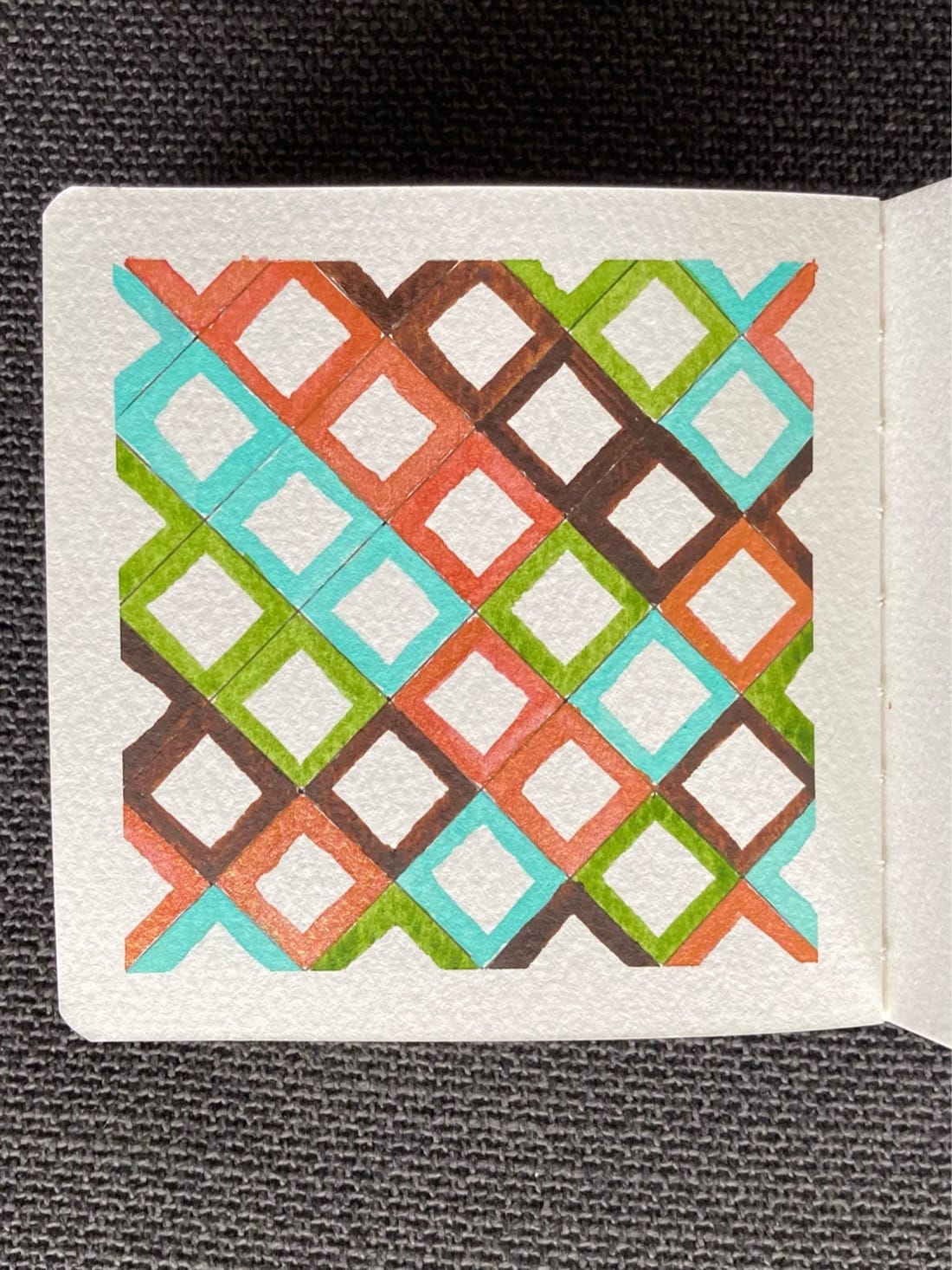 A watercolor painting of a diagonal grid. Each square is outlined in either brown, pale blue, green, or orange-red.