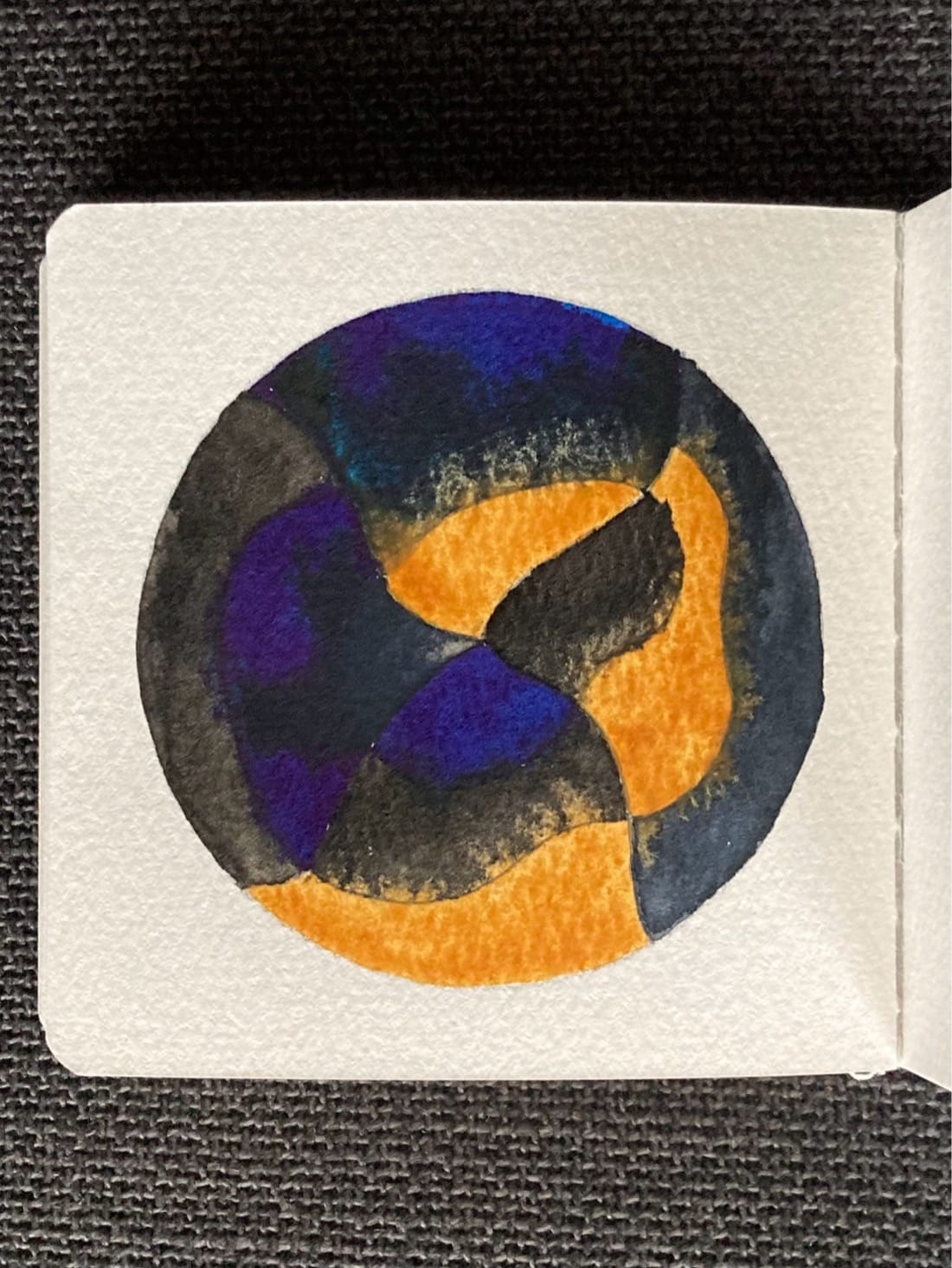A watercolor painting of an organic circular grid. The circle is divided into four wavy wedges, which are each divided into three irregular sections. Each section is painted with black, dark blue, grey, or dark yellow. The paints in each wedge have been allowed to bleed into each other, but not into the paints in their neighboring wedges.