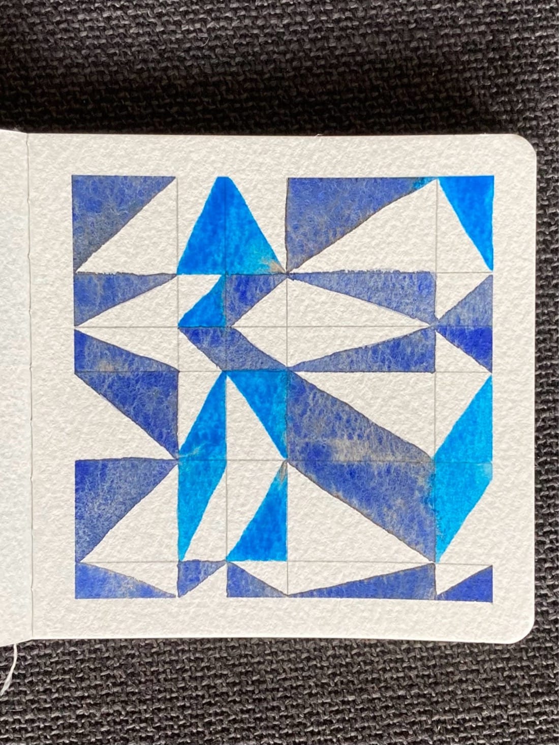 A watercolor painting of an irregularly spaced grid. Each rectangle within it is half-painted across a random diagonal. The rectangles that are taller than they are wide are painted with a bright sky blue, while the others are painted with a deeper blue that has granulated with an light yellow/grey color in places.