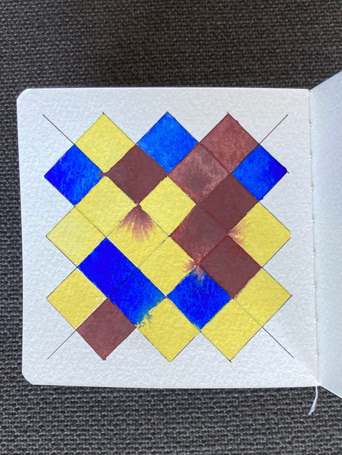 A watercolor painting of an angled grid with the squares randomly filled with buttery yellow, deep burgundy, and bright blue. In a few places, the colors have bled into each other.