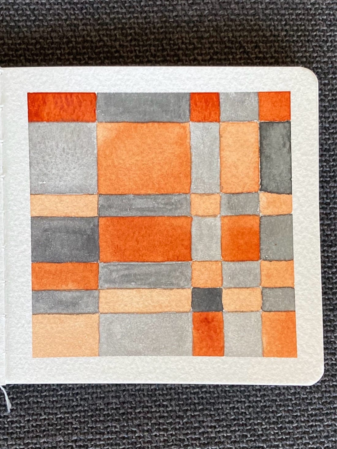 A watercolor painting of an irregularly spaced grid. It’s painted in a checkerboard pattern of orange and grey. The paint saturation from section to section. The grey paint is sparkly from mica in the pigment but it is difficult to see in the photo.
