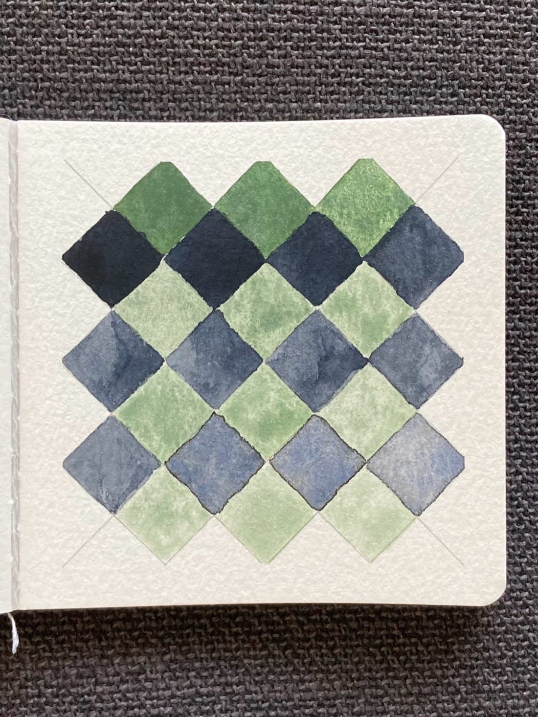 A watercolor painting of an angled grid painted in a green and grey checkerboard pattern. The diamonds are darker at the top of the page and get lighter the lower they are on the page.