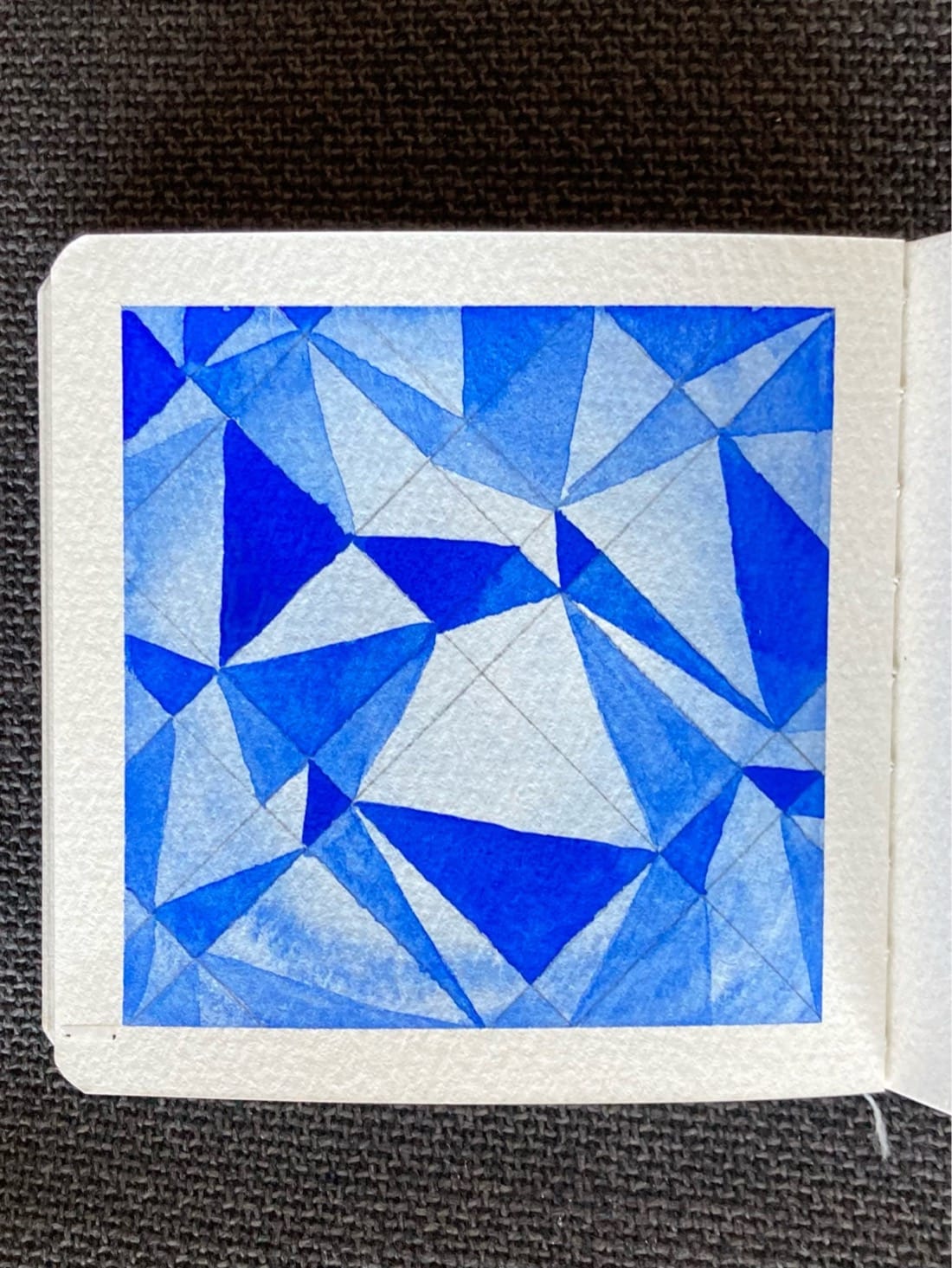 A watercolor painting of an irregularly spaced angled grid. The background of the grid has been painted with a light wash of blue which is darker in the corners and lighter in the middle. Each rectangular section in the grid has one triangular half painted with medium to dark cobalt blue.