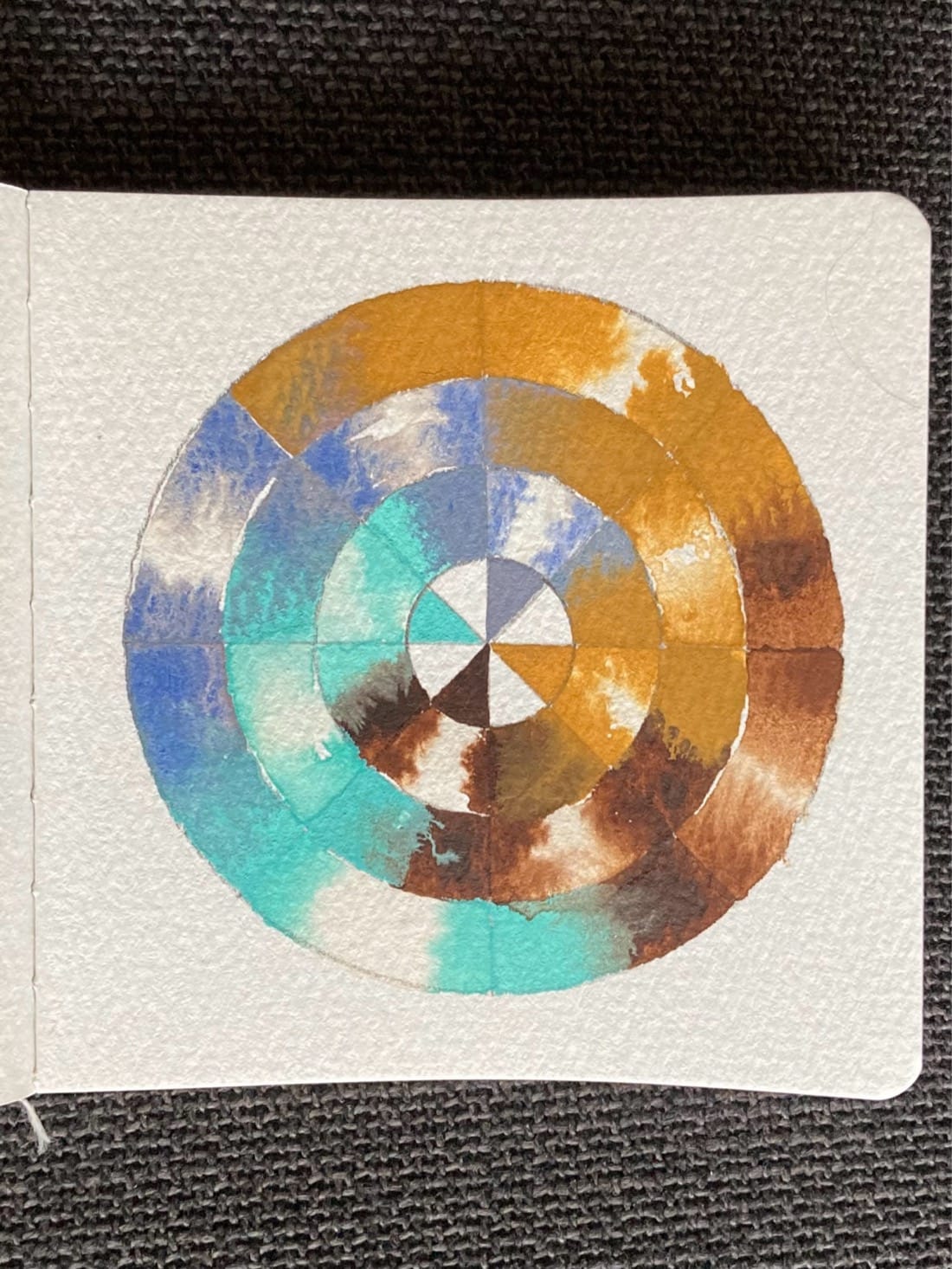 A watercolour painting of circular grid. The circle is divided into 8 wedges, with four segments in each wedge. The segments in the three outermost rings of the grid have an alternating pattern of a) two colours that meet in the middle of the segment, and b) one colour that bleeds towards the middle for the segment but does not meet.