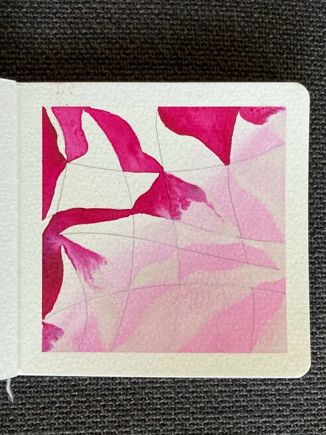 A watercolor painting of an organic grid. The background has been painted in a light wash of pink from the bottom right corner to the diagonal middle. The top left of the grid has each of its segments half-filled with cherry magenta. The bottom right has its segments half-filled with a translucent white paint, through which you can see some of the pink wash beneath it. Where the magenta and white paints meet, the colors have bled together.