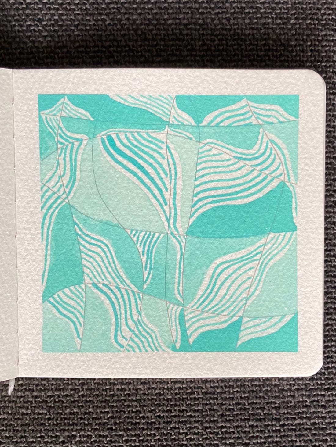 A watercolour painting of an organic grid. Each organically-shaped segment of the grid has one triangular half filled with a medium to light robin’s egg blue and the other half filled with wavy stripes that follow the long edge of the triangle.