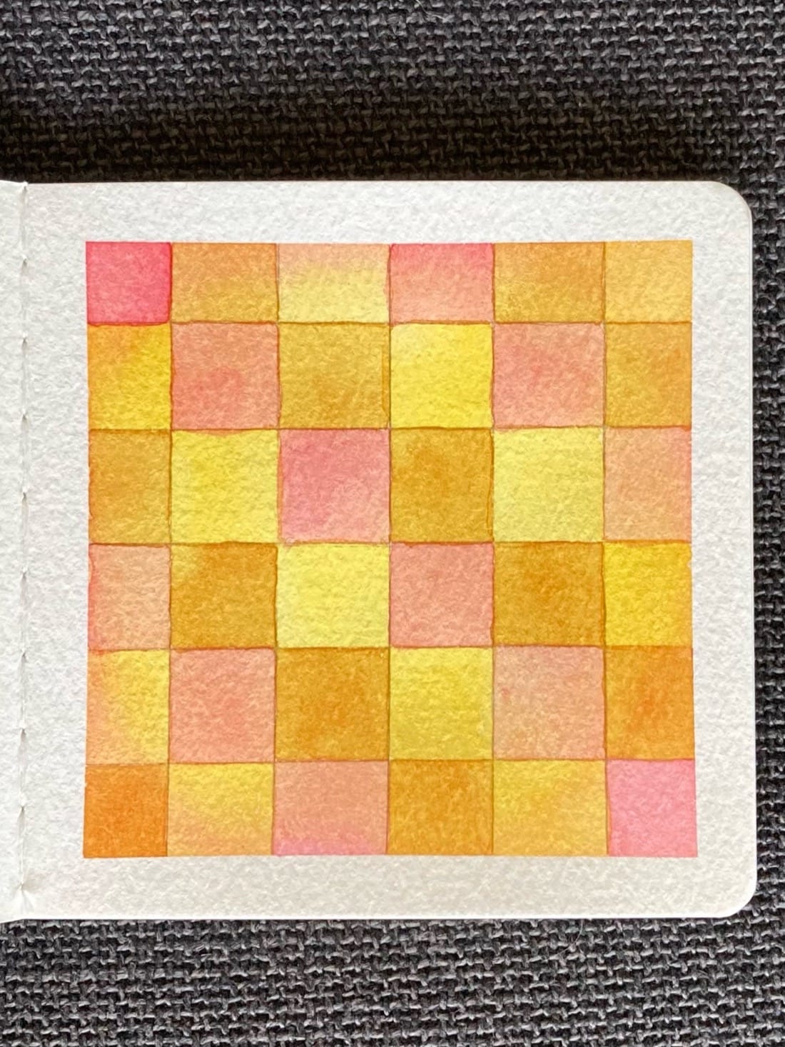 A watercolour painting of a grid. The background of the grid has been painted in concentric circles of light yellow, orange and pink. On top of that, the grid sections have each been painted with a light wash of pink, orange, or yellow, allowing the background wash to slightly show through.