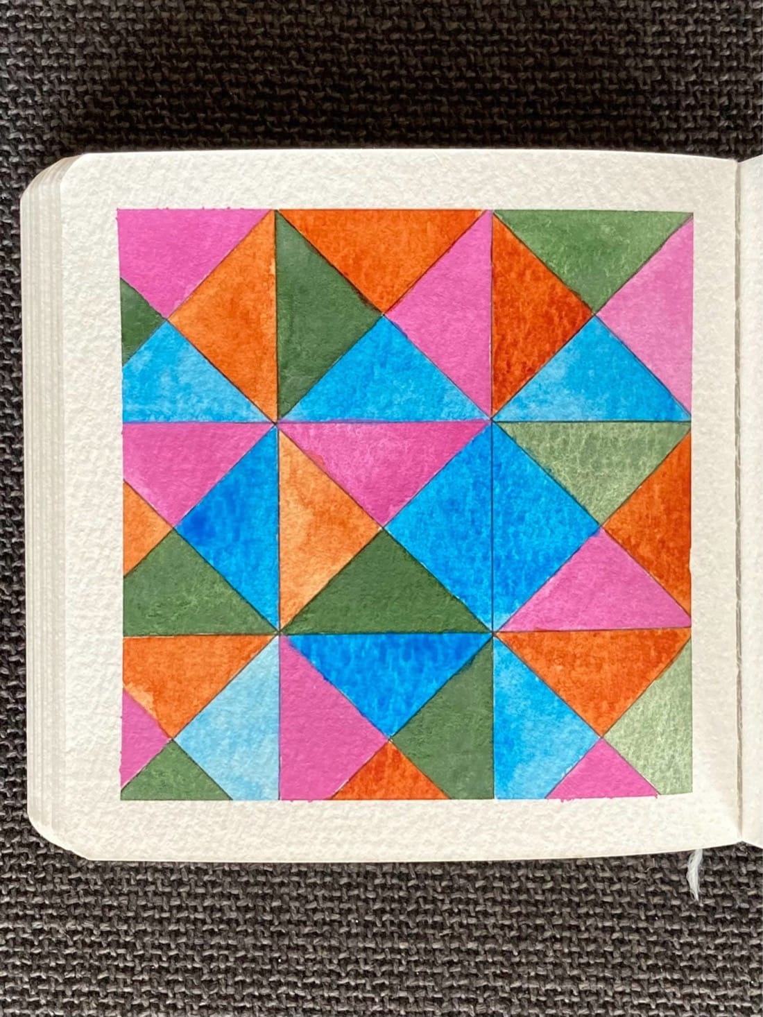 A watercolour painting of a triangular grid. Each triangular section is painted in varying shades of orange, forest green, medium pink, and sky blue.