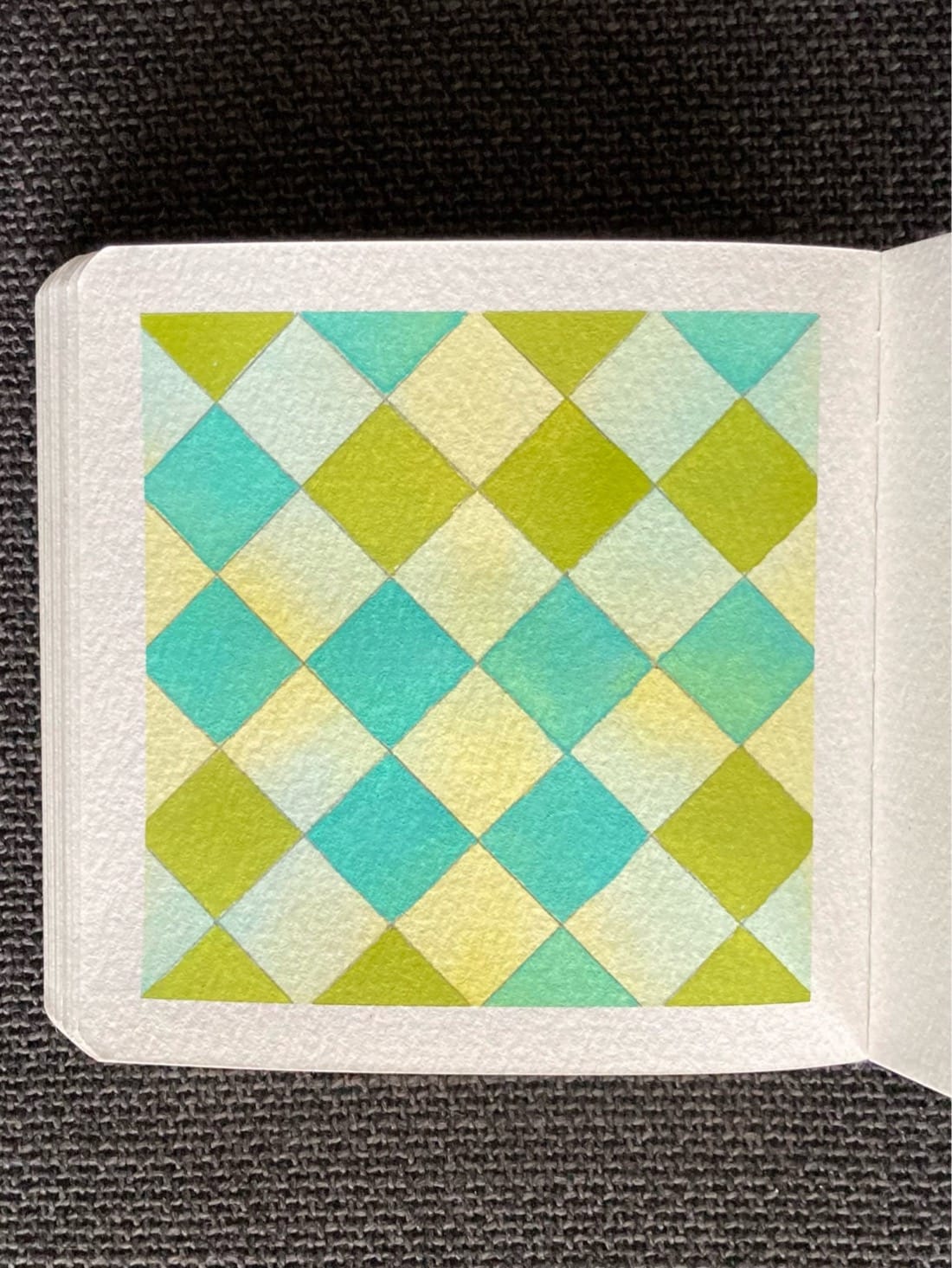 A watercolour painting of an angled grid. The background is painted with a faint wash of blue and light yellow. The grid is painted in a checkerboard pattern with half the diamond showing the background and the other half painted with randomly chosen blue and green paint.