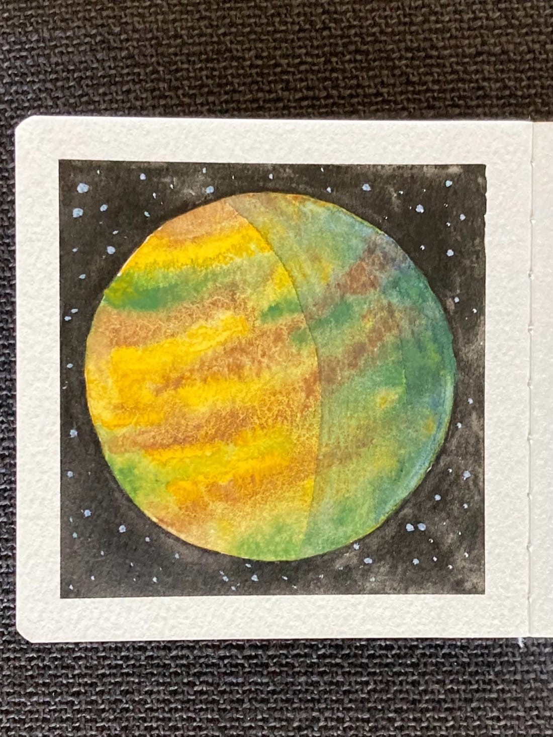 A watercolor painting of a planet in space. Its surface has swirling bands of brown, green, and yellow. The right side of the planet is in shadow. In the background is the inky black of outer space, punctuated by small stars.