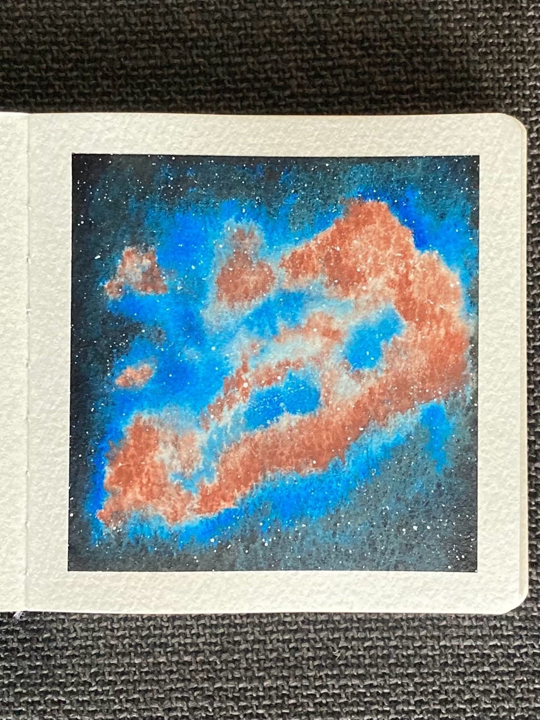 A watercolor painting of a nebula in space. The nebula is an irregular shape spanning from the bottom left up towards the top right. Its reddish brown clouds are surrounded by a blue glow that fades into black. Stars are scattered throughout.