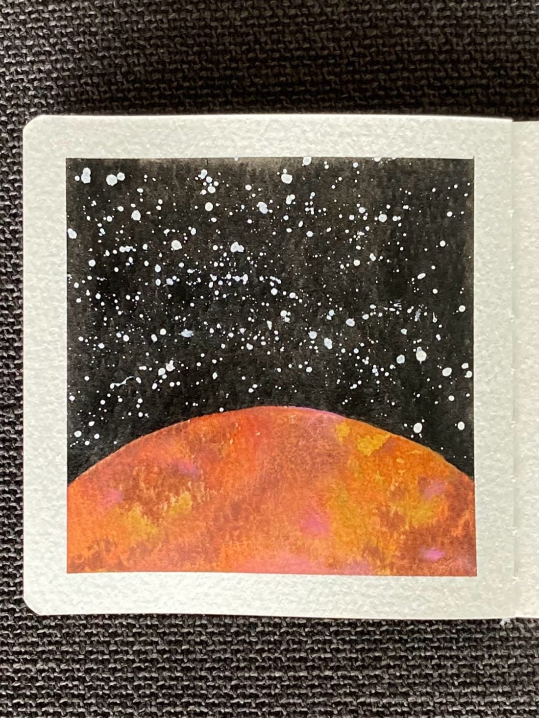 Planet in Beach Rose (gouache), Burnt Sienna, Yellow Ocher, and Cyprus Burnt Umber Warm. Background: Lamp Black Stars: White gouache