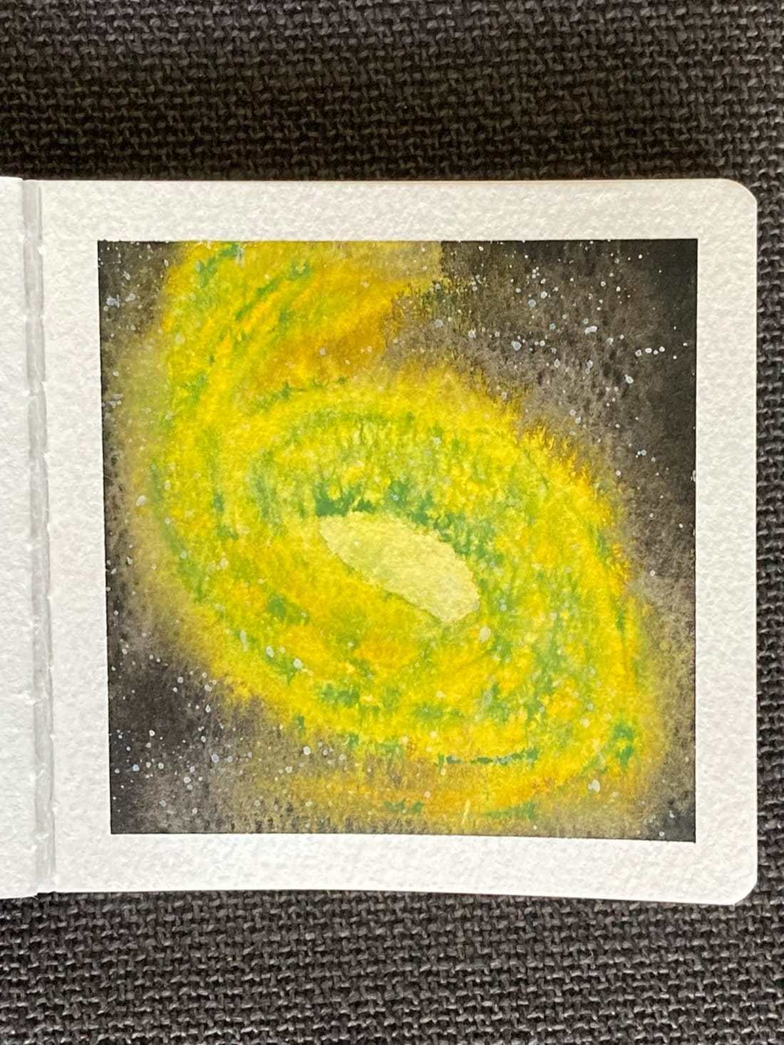 Spiral galaxy in Cadmium Yellow Hue, Poplar Yellow, and Chromium Green Oxide. Background: Lamp Black Stars: White gouache