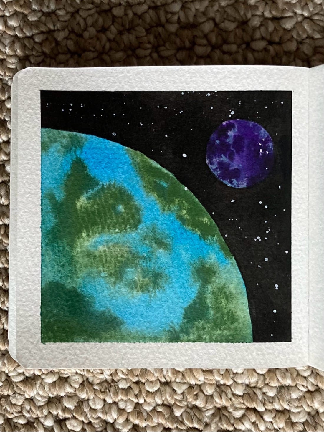 A watercolor painting of a planet & moon in space. The planet fills the bottom left half of the painting. It has green land masses and blue oceans. In the top right corner is a mottled grey and deep purple moon. Behind them is the vastness of space, dotted with stars.