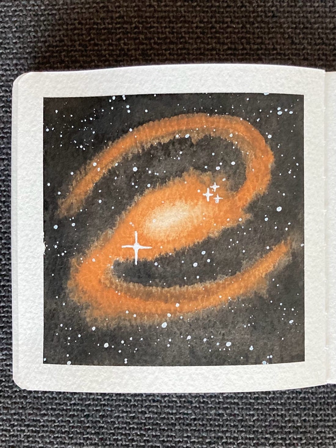 Barred spiral galaxy in Orange Ocher Background: Lamp Black Stars: White gouache
