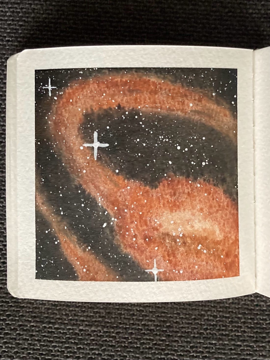 Barred spiral galaxy in Burnt Sienna and Crimson Ocher. Background: Ivory Black Stars: White gouache